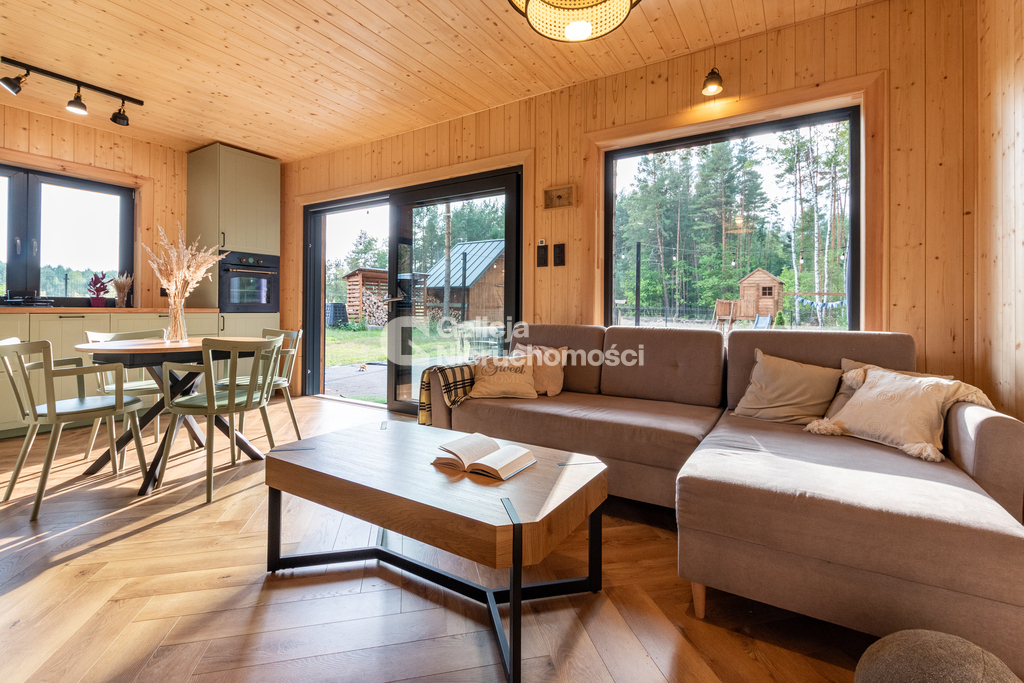 • salon z dużymi oknami i wyjściem na taras