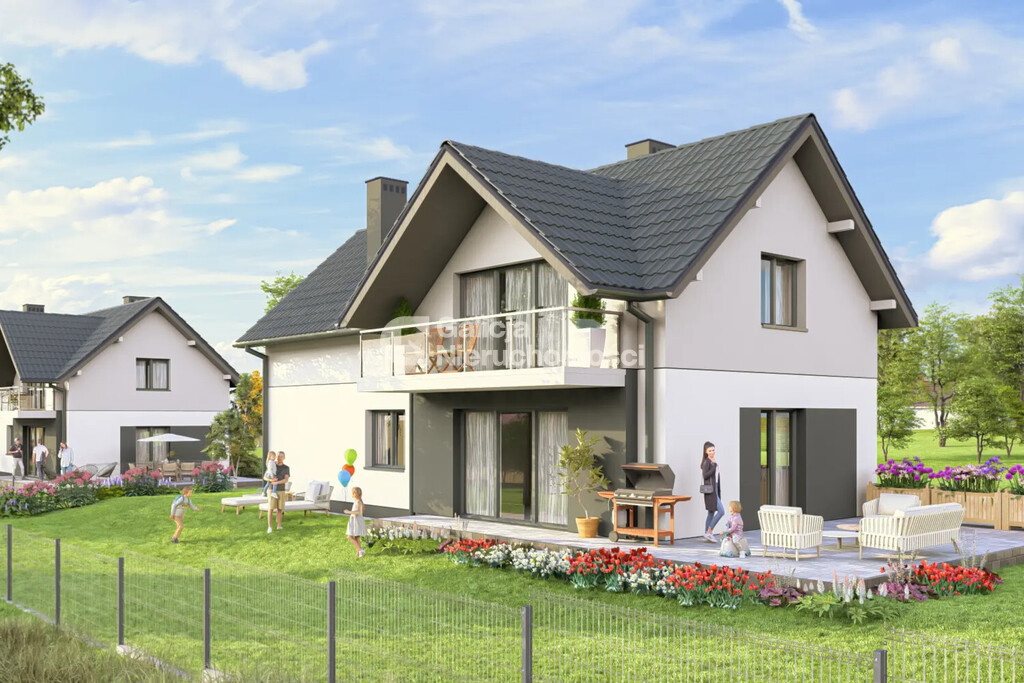 Dom zaprojektowany został z myślą o wygodzie całej rodziny – posiada 5 pokoi, w tym przestronny salon z jadalnią, oddzielną kuchnię, dwie łazienki, pralnię, garderobę oraz garaż w bryle budynku.