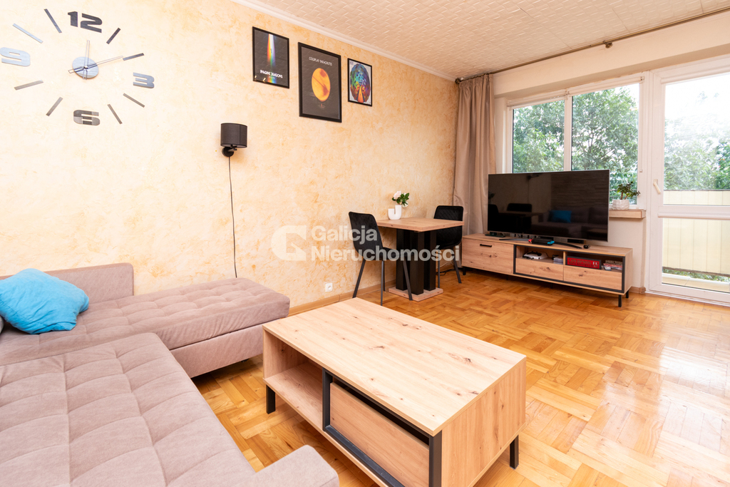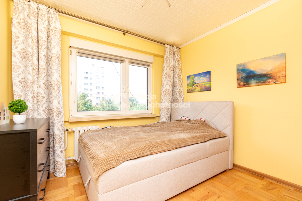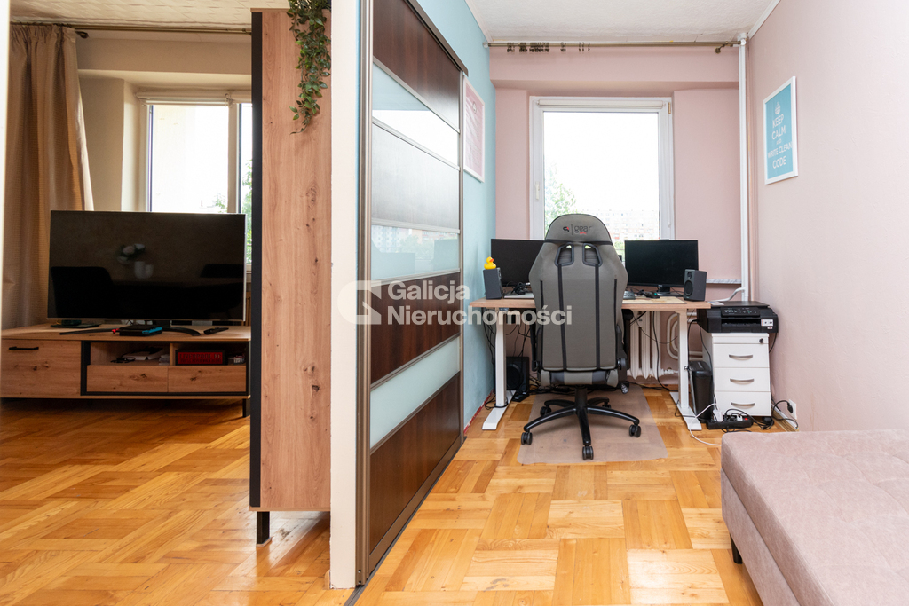 Mieszkanie składa się z przestronnego salonu, który został podzielony przesuwnymi drzwiami, dzięki czemu można wydzielić dodatkowy pokój – idealny na gabinet, pokój dziecięcy lub prywatną strefę relaksu. Dodatkowo w skład lokalu wchodzą osobna, widna kuchnia z meblami i sprzętem AGD w zabudowie, niezależna sypialnia z szafą wnękową, łazienka z wanną, funkcjonalny przedpokój z zabudową oraz balkon typu loggia z widokiem na zieleń. Do mieszkania przynależy również piwnica.