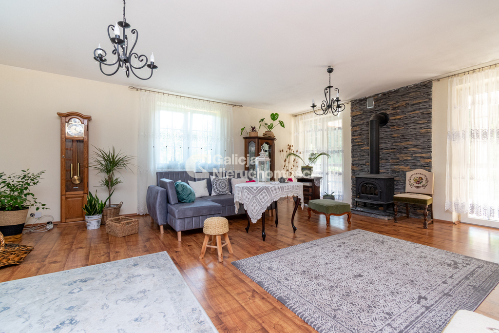 - duży, jasny salon z wyjściem na taras i widokiem na ogród,