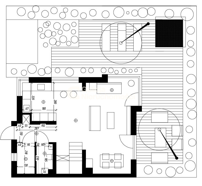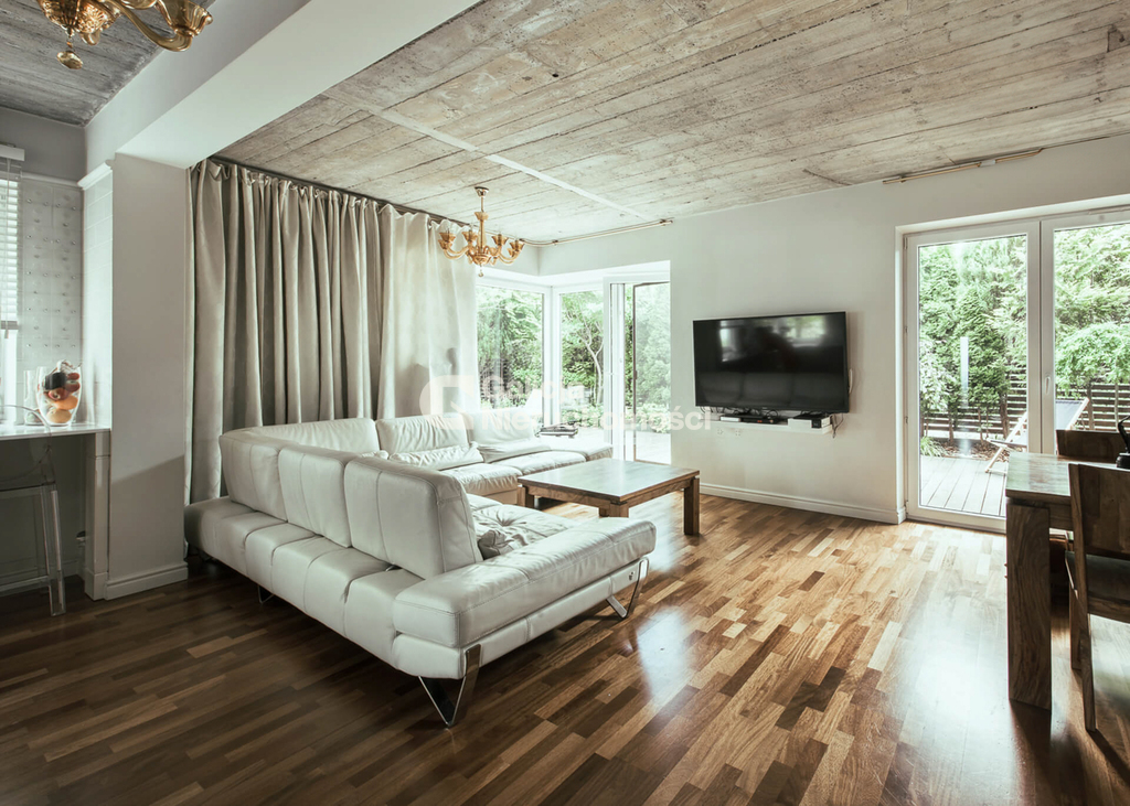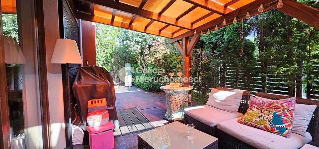 Ogród posiada już wieloletnie nasadzenia co nadaje intymności otoczeniu, taras jest zadaszony i umeblowany tak aby wygodnie spędzać czas w letnie wieczory.